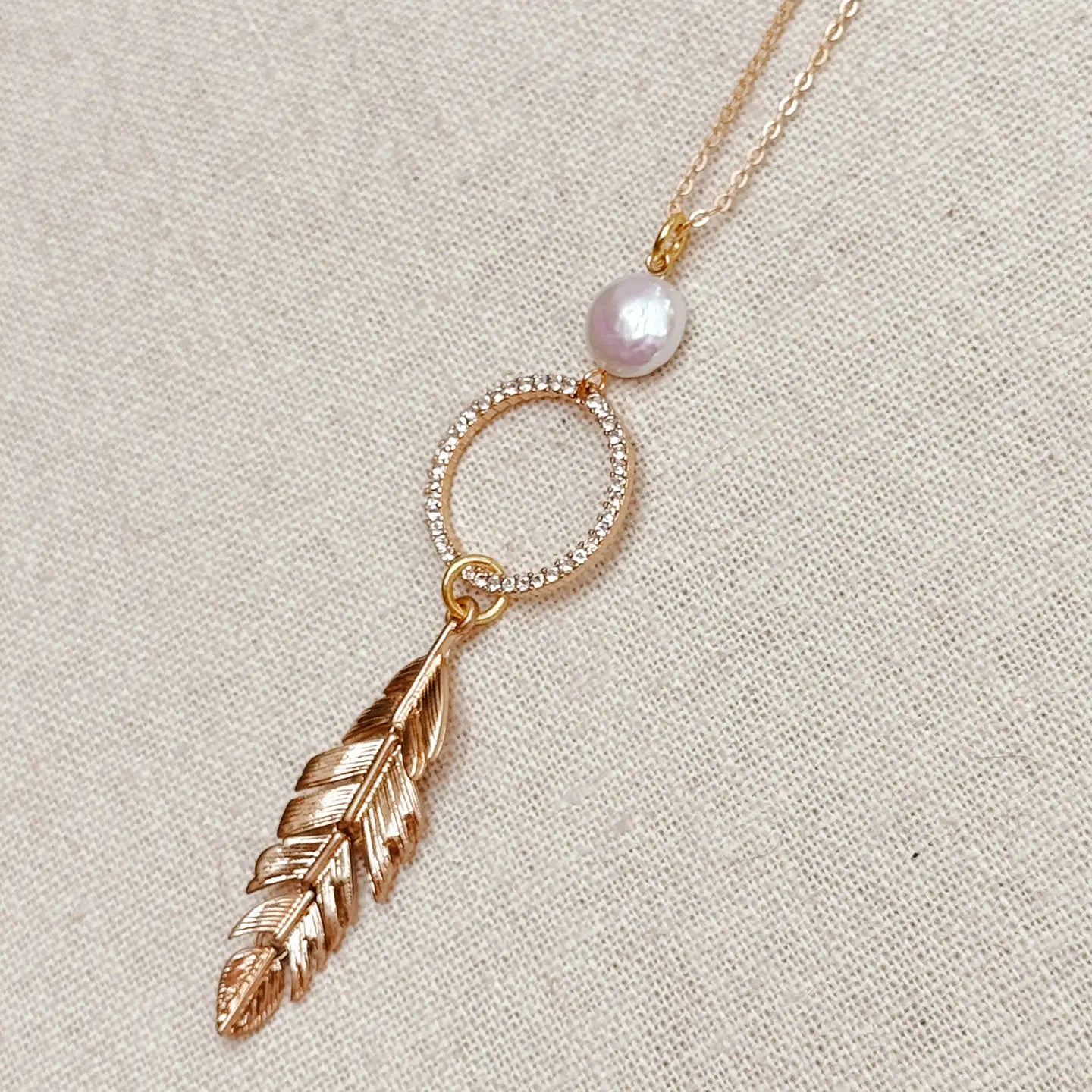 Pearl, rhinestone hoop, feather pendant 2-10448 gold